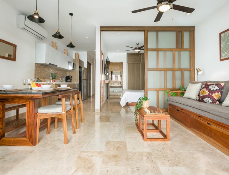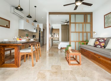 The caribean atmosphere such as turquoise ocean and green mangroves, mixed with mayan architecture inspiration through materials such as marble and wood.